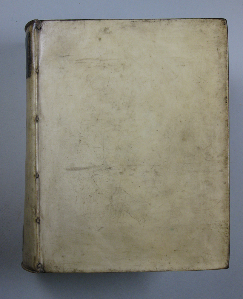 You take a book that is already finished except for the making of a vellum binding. You line a piece vellum with paper and fold the spine into it; then you take pasteboard and on one side you cut it off straight; you brush a little paste on the middle of the flyleaf and lay the cardboard on this [the straight-cut side on the spine of the book, a straw’s breadth from it] and put the whole, when it is dry, in the press; after that you trim the cardboard round the book in such a way that there is a protruding edge on it [the squares: the cardboard is a little larger than the book]; then you put it in the vellum [the spine of which has already been folded] and push the points [slips] through once only [towards the outside] and put the whole back in the press; but first you brush the cardboard [with paste] and lay the vellum on it, and only then do you put the whole in the press.