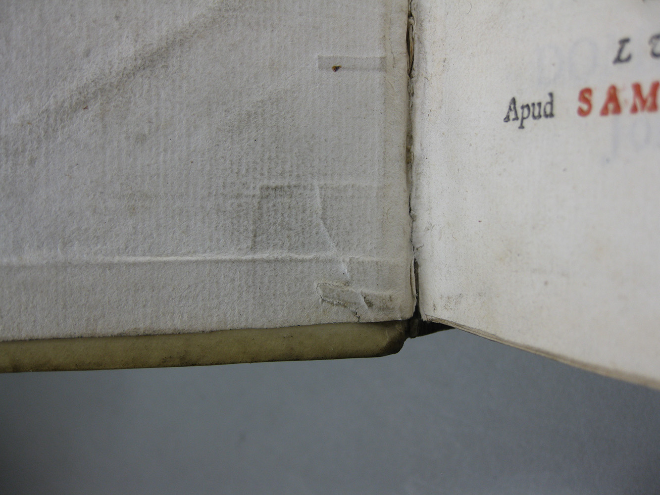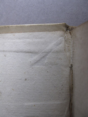 The binding found on a book in Lambeth Palace Library (Johann Marck, In Præcipuas quasdam Partes Pentateuchi Commentarius, Leiden: Apud Samuelem Luchtmans, 1713, Lambeth Palace Library, A26.1 Ψ) as part of the survey project undertaken this January by four students on the Camberwell conservation course, appears, however, to offer yet another variation which does create an inboard binding, but which from the outside looks just like a parchment-covered laced-case binding with boards (Fig. 1). In this example, the boards were first adhered, before the cover was attached (somewhat as in de Bray), to what is now a stub with a torn edge (but which may originally have been the inner half of a complete leaf) and also to the extensions of transverse parchment spine linings, right up the spine edges of the boards (not as in de Bray, who stated that there should only be “a little paste on the middle of the flyleaf”). This results in the head and tail ends of the stubs lying under the turn-ins, which indicates that the boards were attached permanently to the endleaf stubs before the book was covered. This form of board attachment was reinforced by the fact that the extensions of the transverse spine linings were also adhered to the insides of the boards under the stubs. At head and tail, therefore, the lining extensions and the stubs crossed the joints, and this in turn meant that they had to be lifted to allow the cover to be turned in. When the binder lifted the extensions, he also lifted with them the part of the paper stub that that was pasted over them. Before pasting them back, after the cover was turned in, he cut the lining extensions short at an oblique angle, which left the exposed surface of the boards under the cut away portions clearly visible under the pastedowns, thus revealing the sequence of the binding process (Fig. 2). The sewing-support and endband slips must have been laced out through the cover as it was put onto the book and were then laced back inside the cover after it was attached to the boards. The slips therefore lie over the stubs, but underneath the pastedown. In the absence of any name in the literature, I have named this structure an 'inboard binding with a laced cover'.