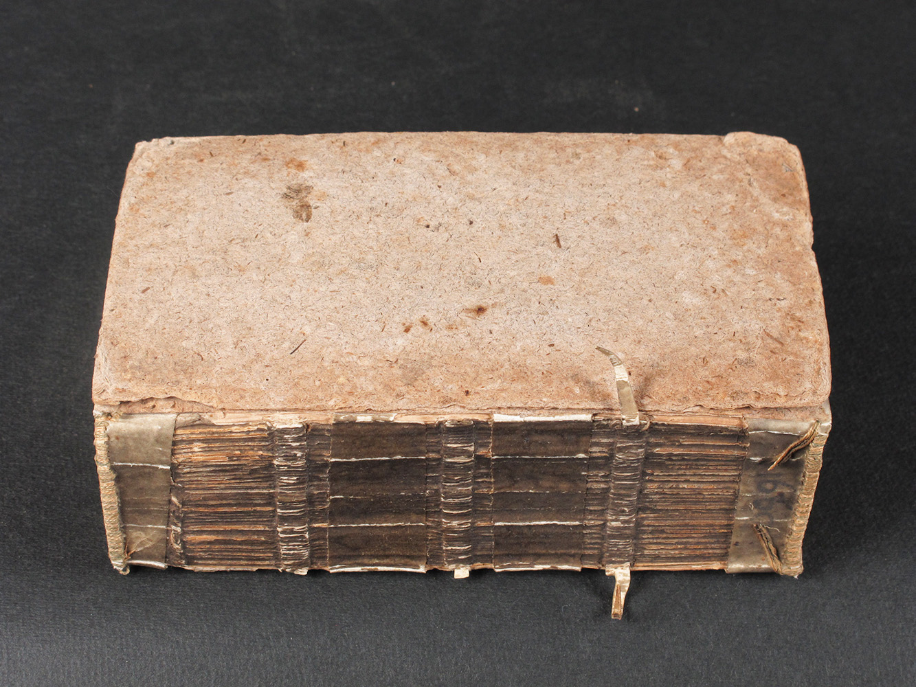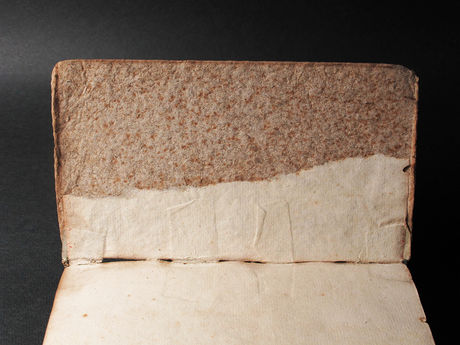 A book with almost exactly the same structure, but which was never covered, survives in the Herzog August Bibliothek (Neu-Vollständigers Marggräff. Brandenburgisches Gesang-Buch, Bayreuth: Johann Gebhardt, 1660 (HAB: Yv 1278.8° Helmst)), the only difference being the use of stuck-on endbands of a typically German sort with a secondary sewing rather than the sewn endbands of the typically Dutch sort. The stub (with a torn edge) of the outermost endleaf was pasted to the inside of the board over the transverse lining extensions (Figs. 3a and 3b). Had the book ever been covered, at least part of the head and tail ends of this stub (and the endband lining extensions under them) would have needed to have been lifted in order to allow the cover to be turned-in over the head and tail edges.