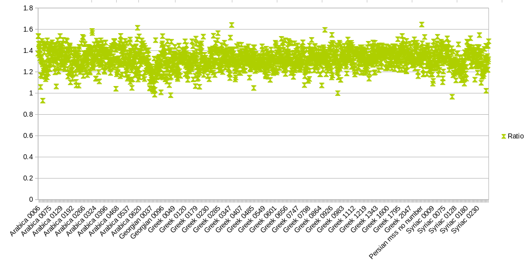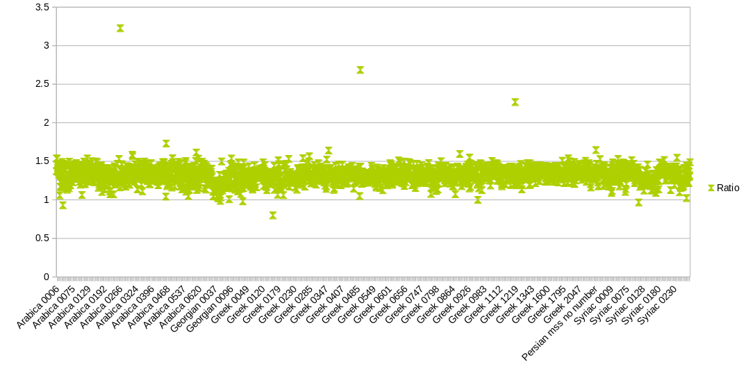 I quickly produced a chart of ratios of height/width on a spreadsheet and I plotted a chart (Figure 1). Sure enough the aspect ratio was relatively similar (between 1 and 1.6), but I could spot suspicious outliers. It would have been extremely difficult to identify these by looking at measurements. I got the shelfmarks of the books, checked these dimensions and indeed they were wrong. In one case the height had been swapped with the width. In another a figure was missing. After correcting the outliers the new chart (Figure 2) looked a lot more reassuring. The border points in the new chart have been checked and they are indeed strange shaped books.