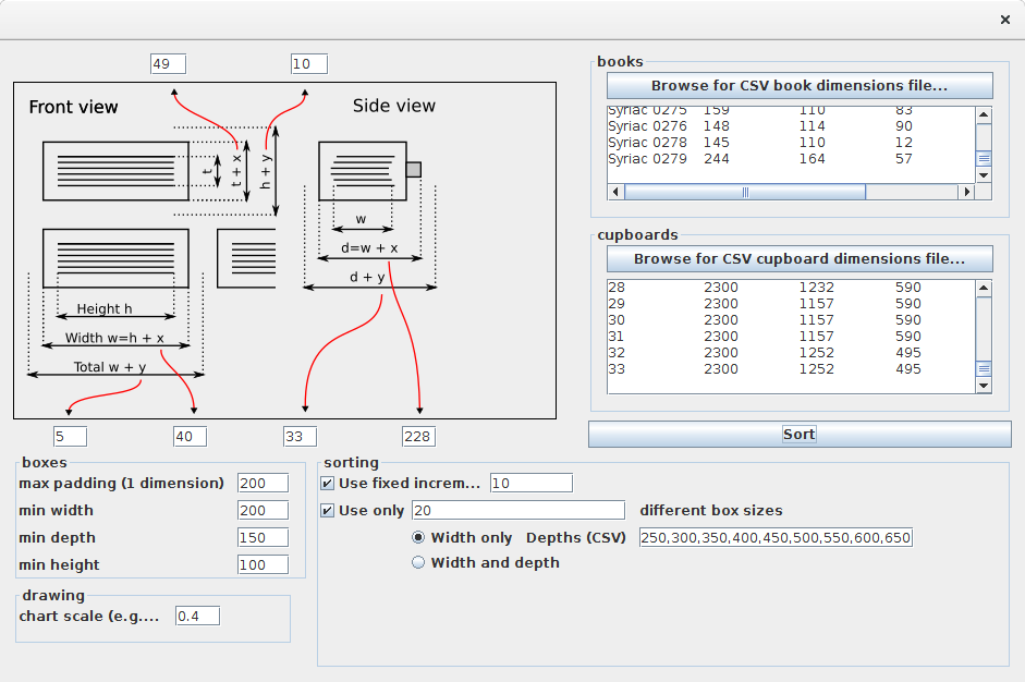We are now reasonably confident that these dimensions are optimised and therefore I started looking at the data from the St. Catherine's database to extract the book dimensions. This was straight-forward. I then fired up my NetBeans "booksorter" project and without much trouble a solution for sorting and stacking the boxes was ready. I did notice some strange looking books in the resulting chart, so I started looking more careful at the measurements.