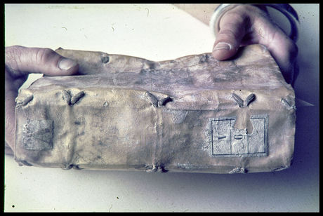 This is the early sixteenth-century binding from the flooded stacks of the Biblioteca Nazionale in Florence that fired Chris Clarkson’s interest in the laced-case limp parchment binding as a conservation structure. The thickness of the goatskin parchment cover, the lacing of all the slips along both joints and a substantial sewing structure on double alum-tawed sewing supports with structural endbands created a structure that survived not only more than four centuries of use but also saturation with water followed by drying.